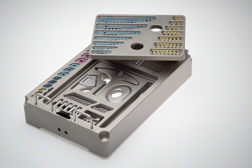 Die Lagerung ist aus Aluminium und wird durch einen durchsichtigen Deckel aus Polypropylene verschlossen, so das jederzeit ersichtlich ist, ob Implantate fehlen. Das Set wird in einem Aesculap Sterilcontainer geliefert.